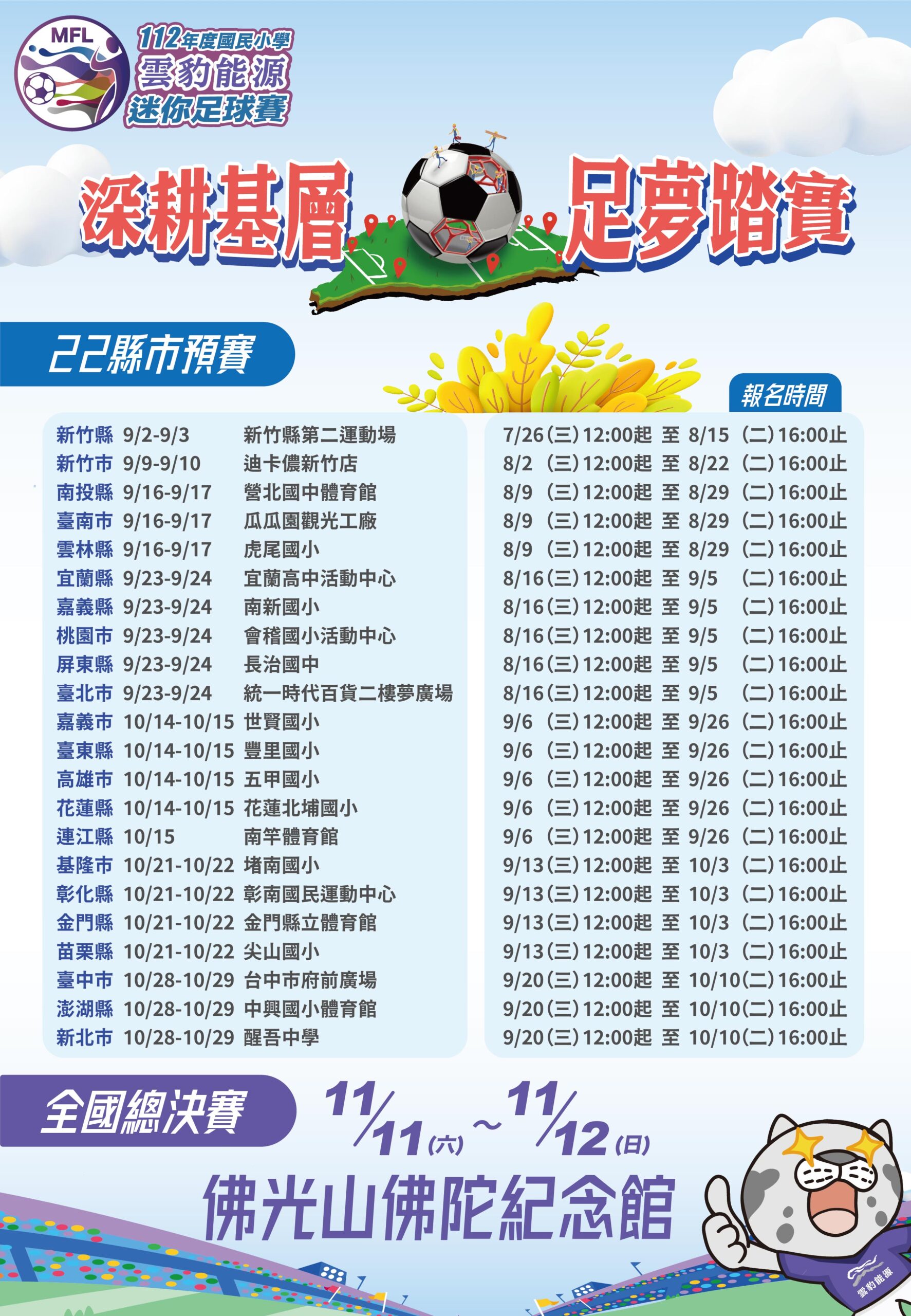 今年特別的是,「112年度國民小學迷你足球賽」將首度舉辦全國總決賽,預計會在11月11日至12日於佛光山佛陀紀念館舉行,讓全台22縣市的小小選手們齊聚參與切磋球技,成為賽事一大亮點。